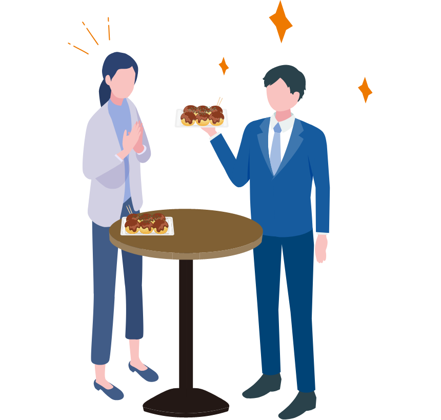 事前に打合せを行い提供総数を決めさせていただき、ご依頼者様の費用負担の元、たこ焼きをふるまいました。今回の出店は、懇親会へ参加いただいた社内外の方々にお配りするようなケースです。